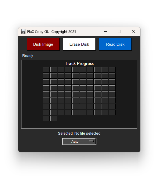 FluxCopy GUI is super simple and only has three options Select disk Image – Erase Disk – Read Disk – the disk format can be left to Auto or if you know the specific format it can be selected from the dropdown